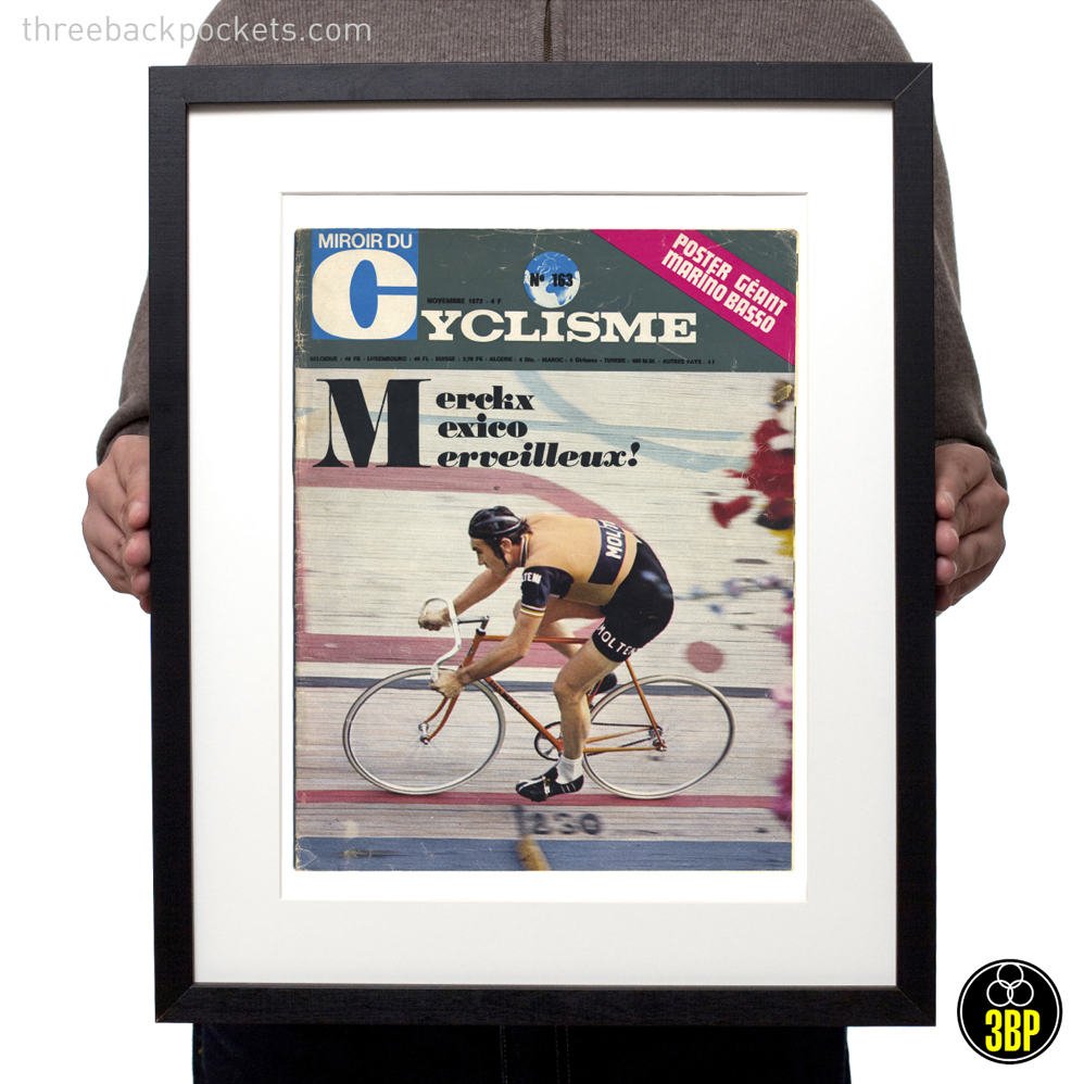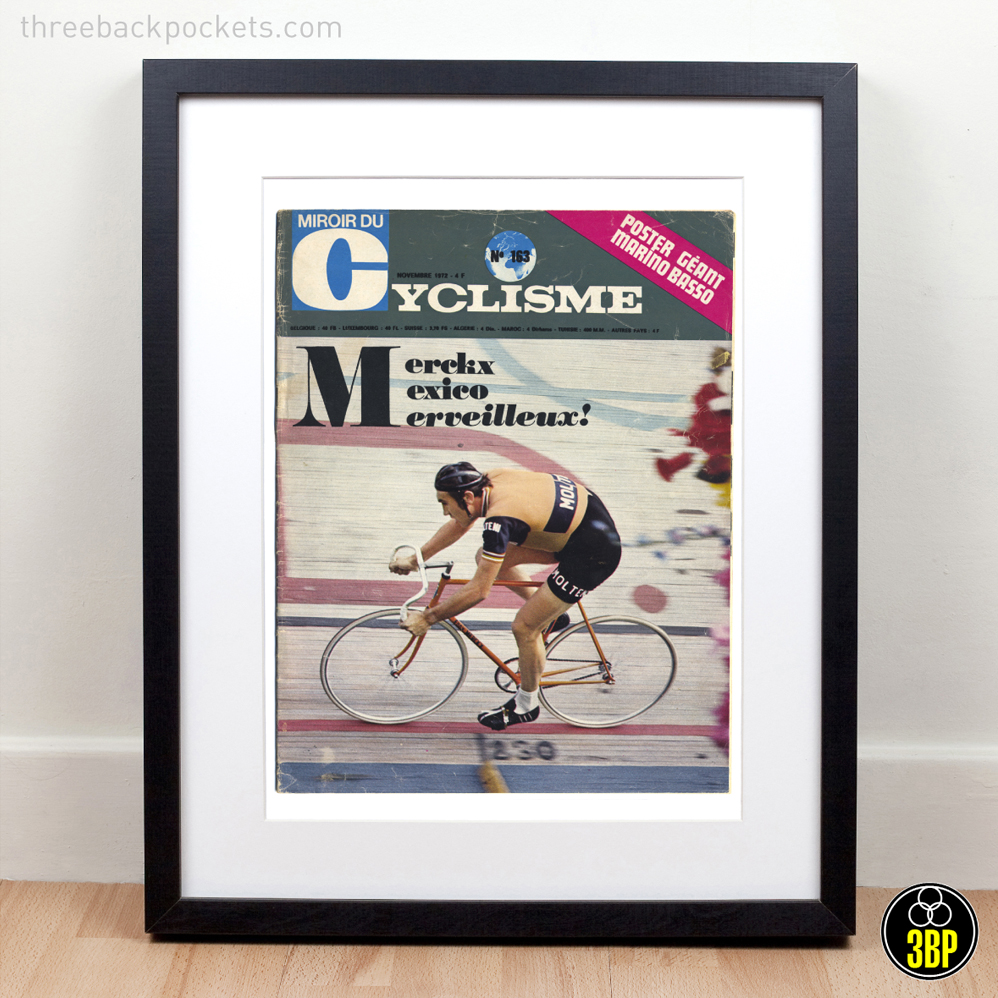 This wonderfully designed cover features the legendary Eddy Merckx in the saddle as he set a new hour record, it has been scanned and is available as a life size photographic print ready to be displayed as it so richly deserves.